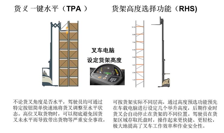 本款叉車主要適用于窄巷道貨架之間高位存取貨物,高效、安全