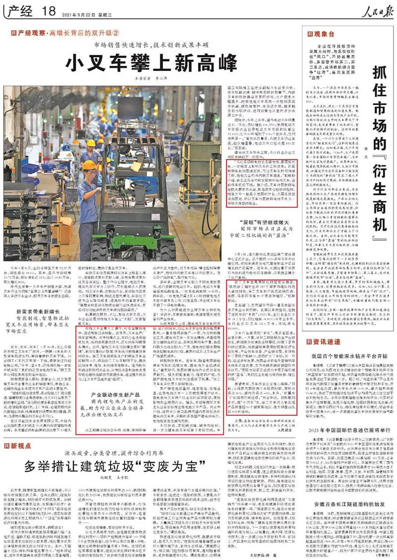 《人民日報》指出,想搶占新市場,叉車企業(yè)還需為傳統(tǒng)叉車裝上“大腦”,發(fā)展智能叉車。