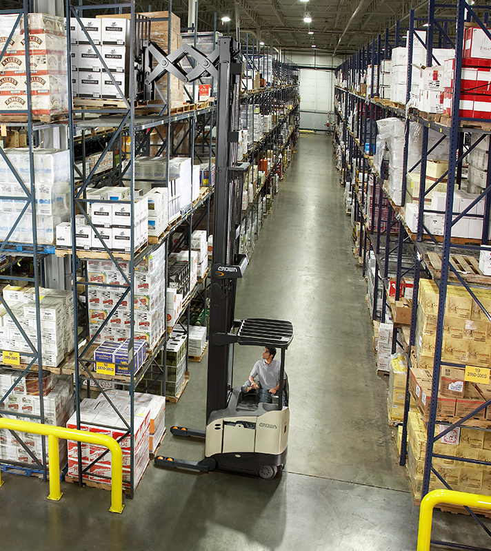 普通高舉升叉車即可,與滾筒式軌道搭配:叉車將貨物搬運(yùn)至貨架高的一端,貨物利用自重滑下存儲(chǔ)。